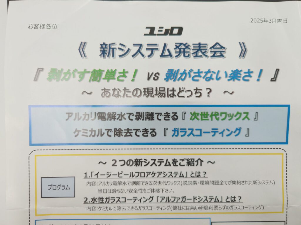薬品で剥がせるガラスコーティングも使い方ではとてもいいものだと感じました。イージーピールフロアケアもワックス自体はとてもいいものだと思いましたし。