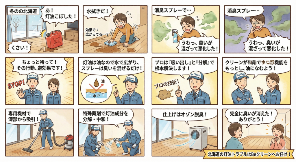【北海道のプロが教える】灯油をこぼした時の「絶対NG行動」と正しい消臭手順|臭いが取れない理由とは?