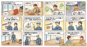 焦って自己流の処置をすると、被害を広げてしまうことがあります。まずは「やってはいけないこと」を知ってください。これを知るだけでも後の処理がずいぶん楽になったり、ニオイを早く消せるようになります。