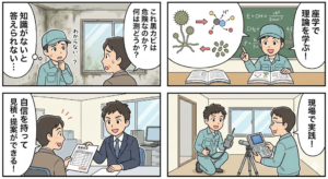 現場での手の動かし方や機材の扱いは、知識さえあれば後からいくらでもついてきます。 しかし、「なぜそうなるのか?」という根本的な化学の理論や、見積もりの組み立て方は、現場でただ闇雲に作業をしているだけでは決して身につきません。