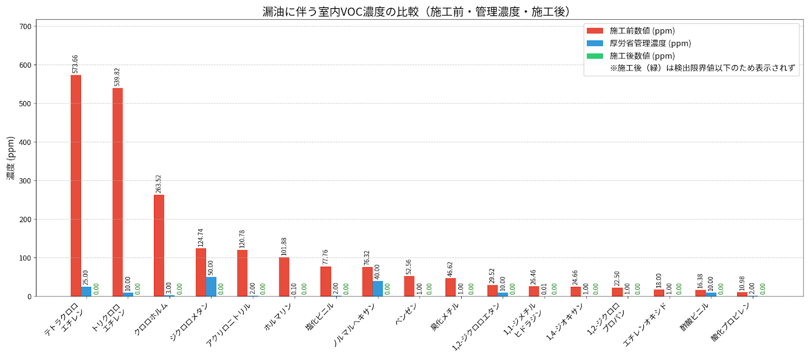 - 赤棒(施工前): テトラクロロエチレンやクロロホルムなど、極めて危険な物質が厚生労働省の管理濃度(青棒)を何十倍、何百倍も超過している状態です。